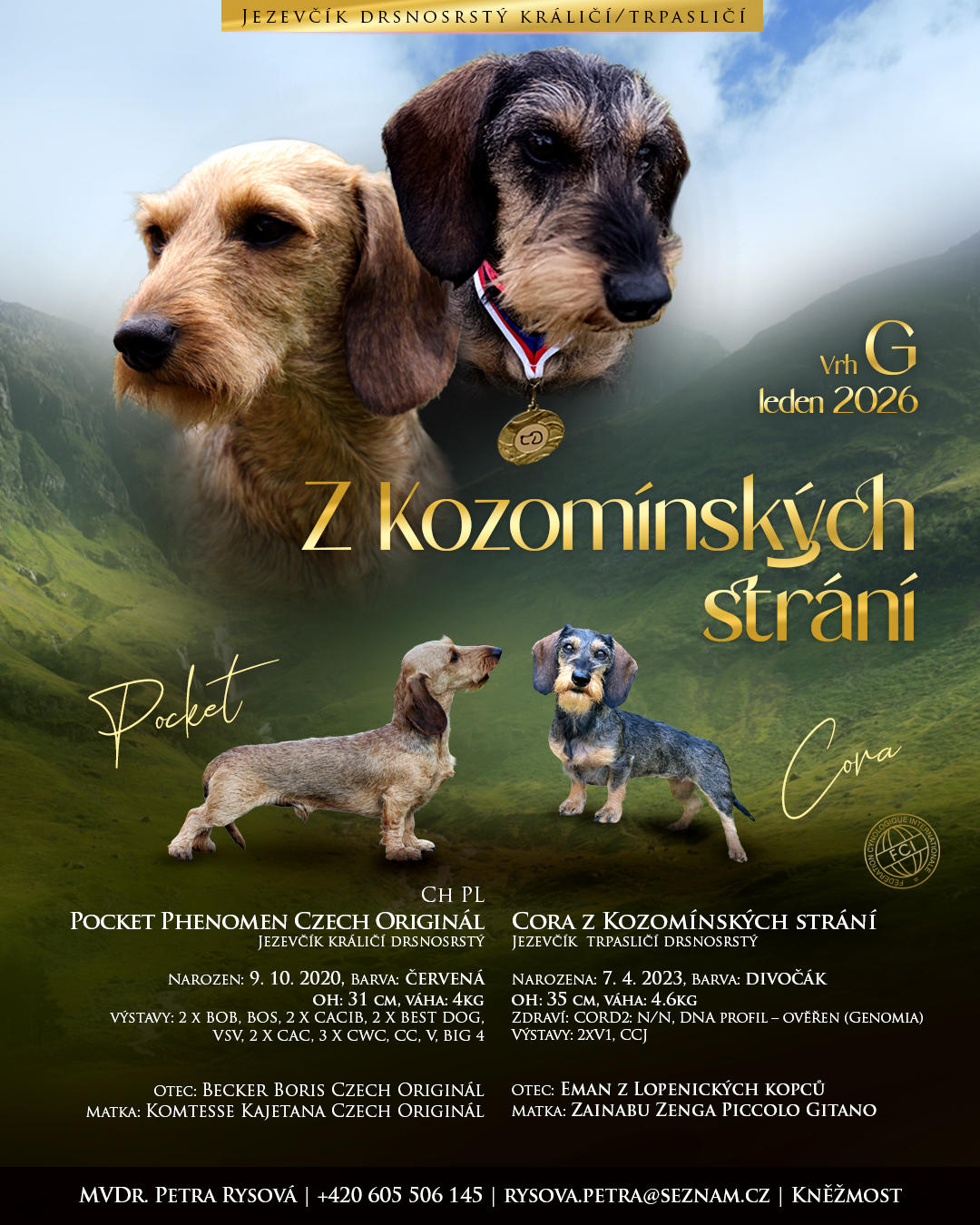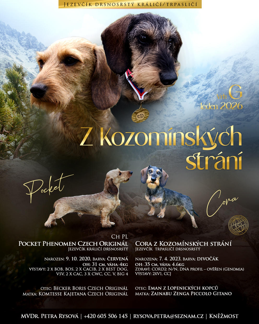 Zadám štěňátka drsnosrstého trpasličího jezevčíka s PP po vynikajících rodičích s odběrem v polovině března. O více informací prosím volejte do ordinace přímo mě. Děkuji, Petra Rysová